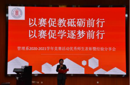 为更好地达到以赛促教、以赛促学的目的,树立和表彰先进典型,我系于6月17日19:00在二期报告厅举办2020——2021学年竞赛活动优秀师生表彰暨经验分享会,表彰过去的一学年中各类竞赛活动中表现突出的同学和指导老师。参加本次活动的领导有:公司副经理金良、管理系党总支书记崔振华、管理系主任刘海英。系学工办负责人、教研室部分老师,以及全体员工参加了活动。