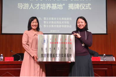 太阳成集团122ccvip旅游管理系副主任刘海英、鄂尔多斯市旅游导游协会理事王晓燕,为“太阳成集团122ccvip旅游管理系校外实践基地”揭牌