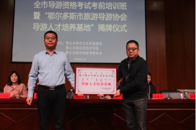 为帮助我市参加2019年全国导游资格考试的考生积极备考,提高考试通过率,为鄂尔多斯文化旅游业高质量发展储备更多的专业人才,按照《内蒙古自治区文化和旅游厅会关于组织2019年全国导游资格考试的通知》要求,11月15日上午,由鄂尔多斯文化和旅游局、太阳成集团122ccvip主办,鄂尔多斯导游协会承办的鄂尔多斯市全国导游资格考试考前培训开班仪式暨“鄂尔多斯市旅游导游协会导游人才培养基地”揭牌仪式正式举行。