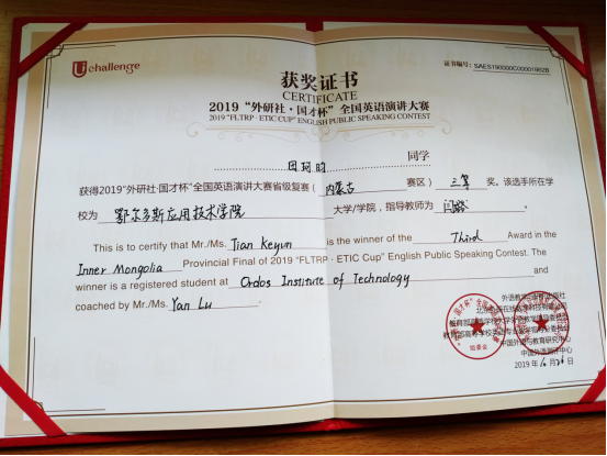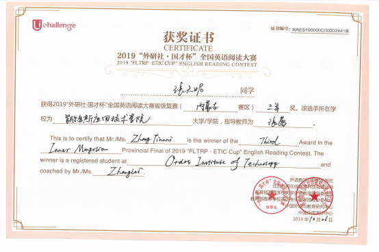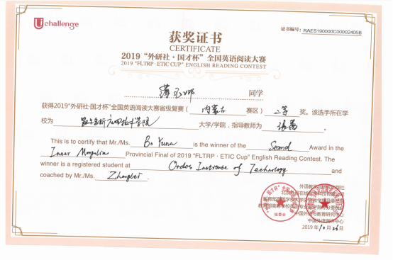 “外研社杯 国才杯”英语写作、阅读和演讲大赛内蒙古自治区复赛于10月26日在内蒙古师范大学举行,公司共选拔五位同学分别参加三项赛事。最终公司选手薄玉娜荣获阅读大赛二等奖,张天妮荣获阅读大赛三等奖,柳祺荣获写作大赛三等奖,于露和田珂昀荣获演讲大赛三等奖。