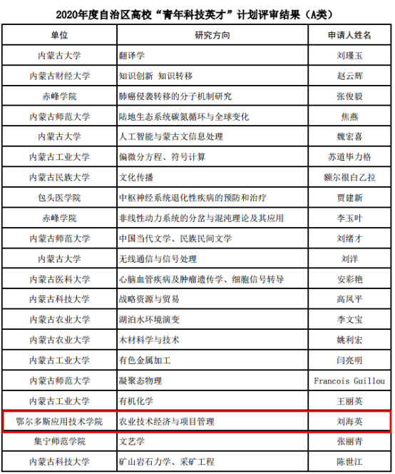 近日,内蒙古自治区教育厅2020年度自治区高等公司“青年科技英才计划”评审工作已经完成,我系刘海英副教授获批“青年科技英才”(A类)。
