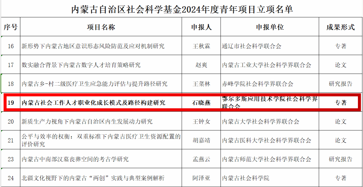 近日,内蒙古自治区社会科学基金评审委员会公布了2024年度青年项目立项名单,社会工作教研室石晓燕老师的研究项目成功获批立项,成为社会工作教研室在此类科研项目中的又一亮点。