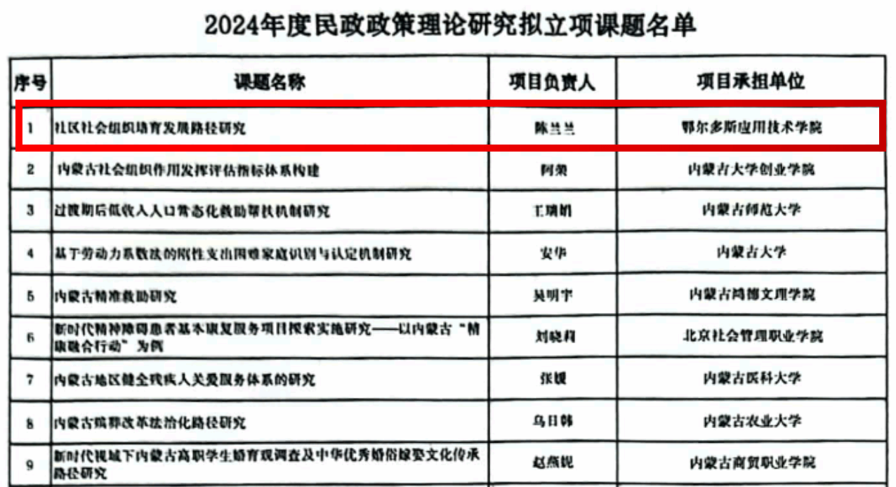 此次陈兰兰老师获批自治区民政厅2024年度民政政策理论研究立项课题,是社会工作教研室在社会科学研究领域取得的又一重要成果。接下来教研室将继续加大对科研工作的支持力度,鼓励广大教师积极参与各类科研项目申报和研究工作,推动社会工作研究不断迈上新台阶。