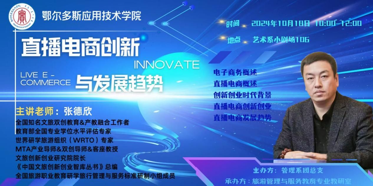 为进一步激发我系师生“双创”活力,加强对直播电商的认识,2024年10月18日,管理系特邀全国知名文旅双创教育&产教融合工作者、教育部全国专业学位水平评估专家张德欣老师来校进行“直播电商创新与发展趋势”的专题讲座,旅游管理与服务教育专业师生100余人参加讲座。