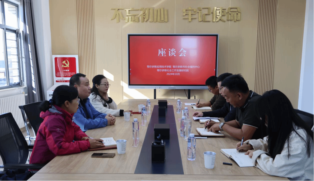 10月10日上午,鄂尔多斯社会工作发展研究院陈引弟、陈兰兰、呼和一行前往鄂尔多斯市儿童福利院,举行校地合作座谈会。儿童福利院经理塔拉、办公室主任扎布、财务总管王瑞、社工部负责人邬君梅共同出席。