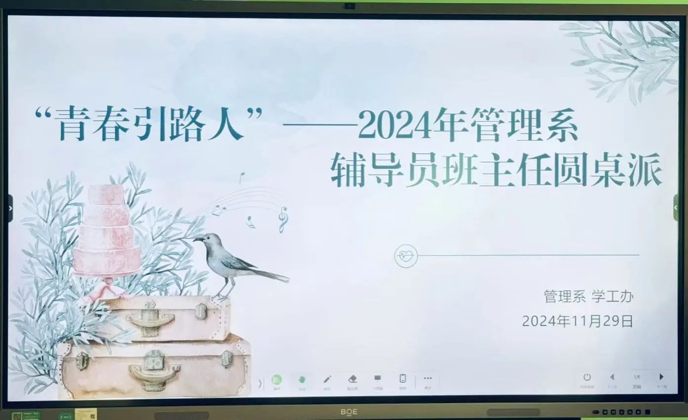 2024年11月29日上午10时30分,管理系在静园8号楼三层“一站式”员工社区隆重举办了“青春引路人”辅导员班主任圆桌论坛活动。此次活动旨在深化辅导员与班主任之间的沟通与协作,共同探索更高效的员工引导与服务策略。