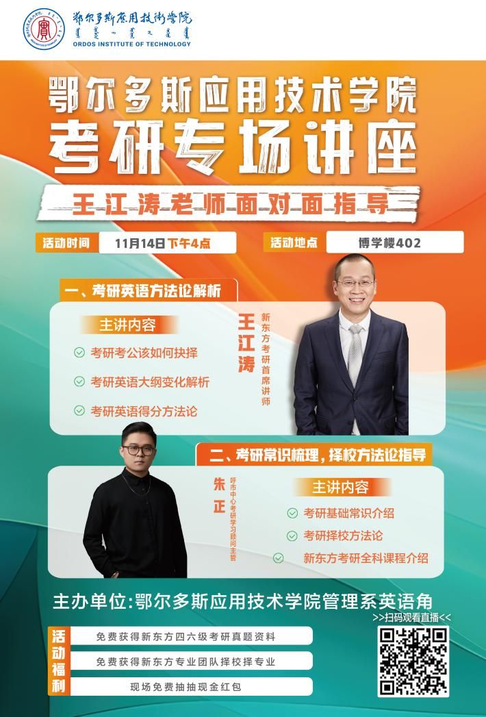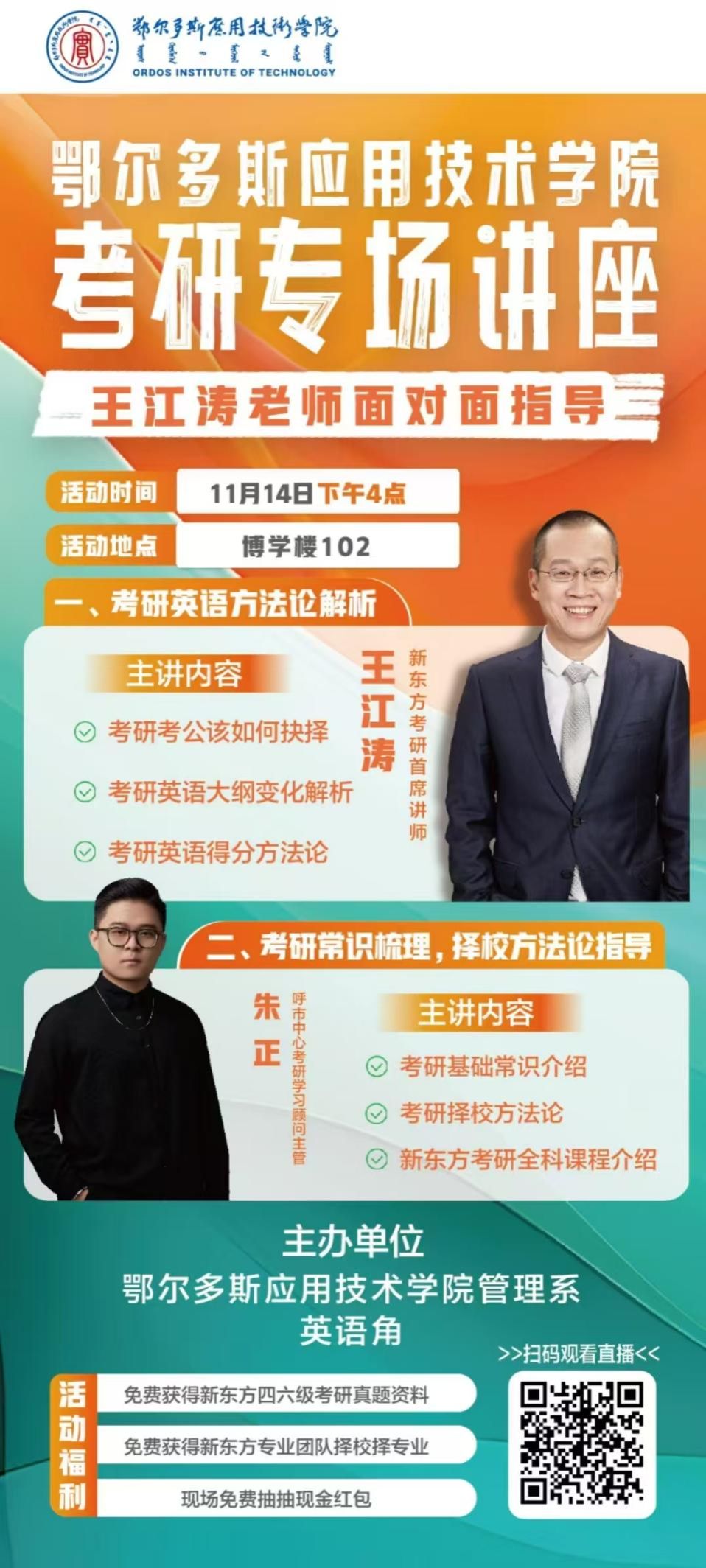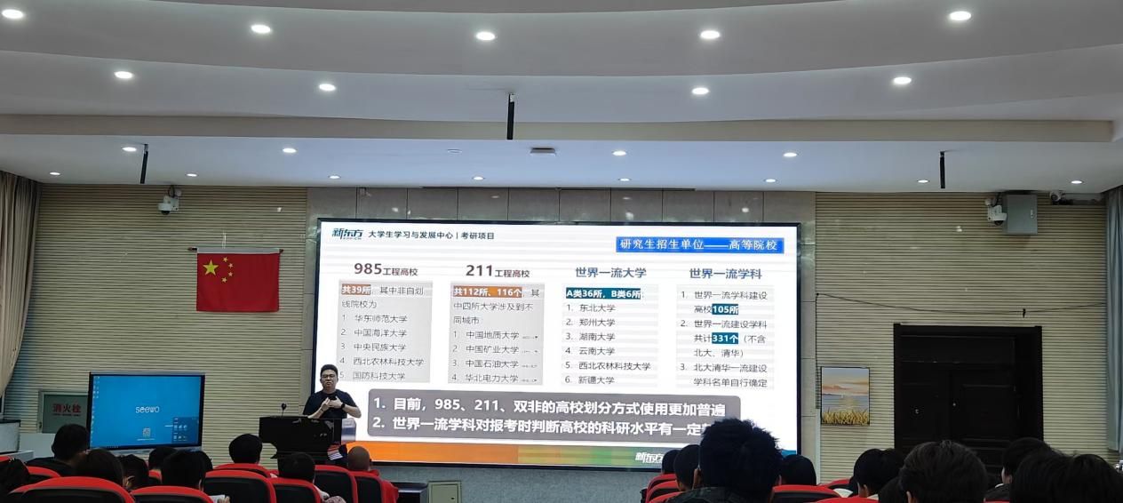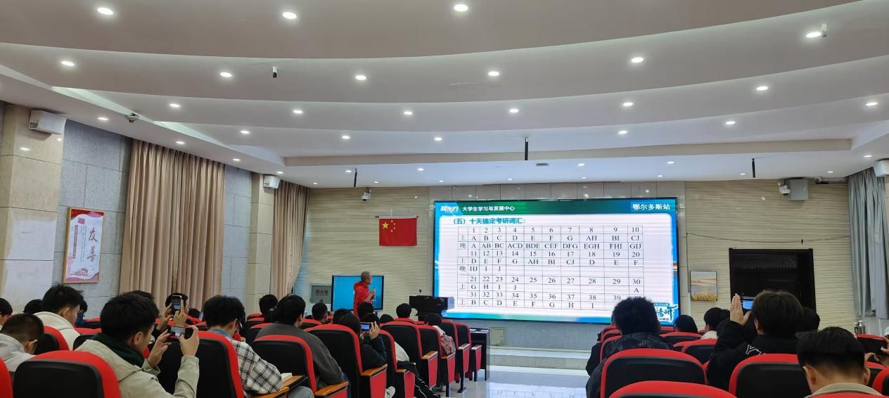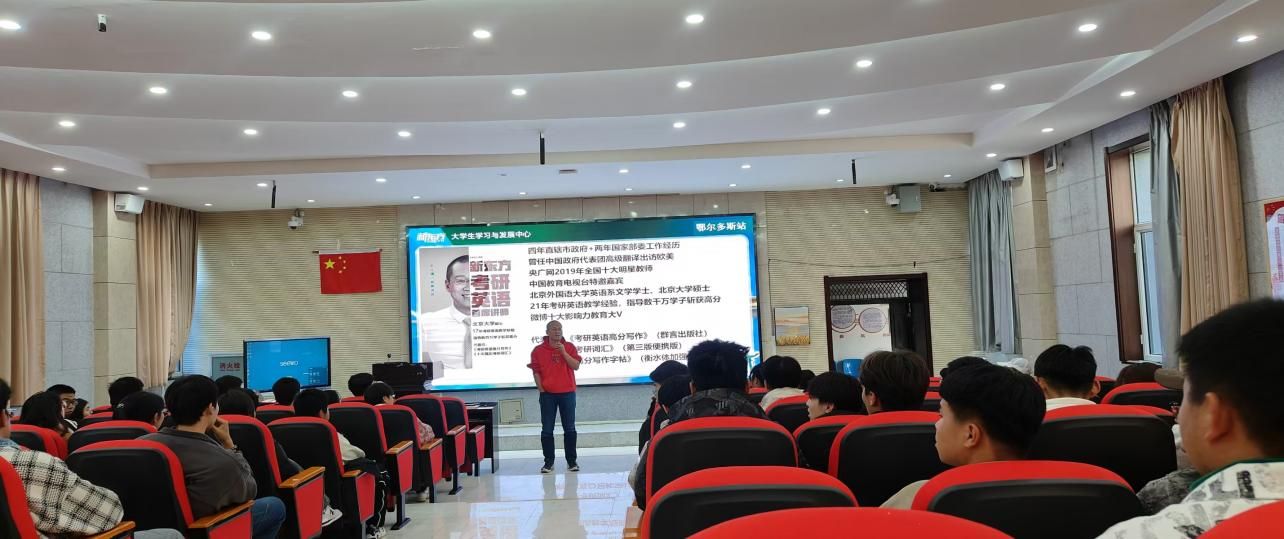 11月14日下午,公司管理系大学英语教研室与英语角联合举办了一场主题为“助力考研梦,一战达硕峰”的考研讲座。此次讲座旨在帮助公司考研学子制定科学合理的英语备考及冲刺计划,明确考研目的,提升考研积极性。讲座邀请了新东方资深英语教师王江涛老师主讲,吸引了近130名考研学子前来聆听学习。