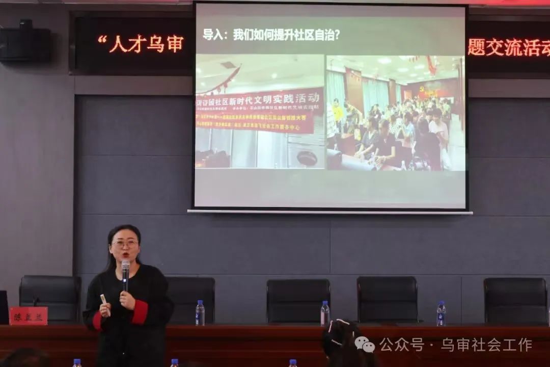 活动当天,来自乌审旗及周边地区的众多社会工作者齐聚一堂,共同探讨社会工作的发展与创新。陈兰兰老师首先为大家带来了题为“社区治理与社区工作实务”的主题讲座。她凭借丰富的实践经验和深厚的理论功底,从社区公益创投如何促进居民自治,深入浅出地讲解了社区治理的核心理念、方法技巧以及在实际工作中的应用。陈兰兰老师强调,社区治理需要以居民为主体,多方参与、协同合作,社会工作者在其中扮演着至关重要的角色。她的讲座内容丰富、案例生动,赢得了在场听众的阵阵掌声。