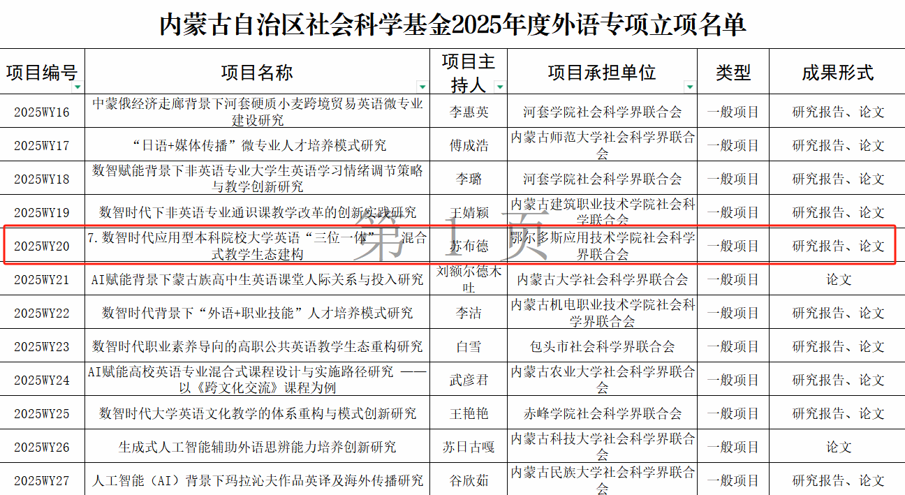 近日,内蒙古自治区社会科学界联合会公布了年度立项名单,公司语言教学中心教师苏布德获批课题立项。
