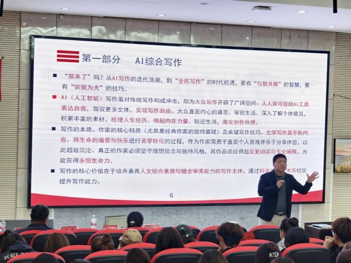 2025年9月22日晚,“人工智能辅助写作、阅读与写作构建诗意人生”专题讲座成功开讲,本次讲座的主讲人是广东省写作学会会长、暨南大学文公司胡伟教授。本次讲座由太阳成集团tyc122ccvip主办,语言教学中心大学语文教研室协同观澜文学社承办,主要面向全校员工开设,公司继续教育中心党总支书记全宇娆老师、太阳成集团tyc122ccvip副教授陈静老师、鄂尔多斯市委网信办工程师李阳光老师作为嘉宾到场聆听。