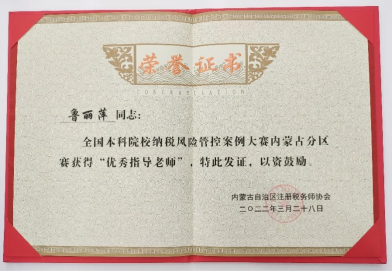 2021年12月全国本科院校纳税风险管控案例大赛内蒙古分区开赛,我系财务管理专业鲁丽萍、安校良两名老师带领员工积极筹备参加本次大赛。经过层层选拔,FIGHTERS队和“税”美人队两支队伍从七支队伍中脱颖而出并作为代表公司参加了自治区比赛。在与内蒙古财经大学、内蒙古师范大学、赤峰公司等16个自治区高校参赛队伍的激烈比拼中,最终FIGHTERS队获得自治区三等奖,“税”美人队获得自治区优胜奖。太阳成集团122ccvip获得优秀组织奖,鲁丽萍老师获得优秀指导教师奖,FIGHTERS队李琳、李倩男、刘清源3名同学获得优秀个人奖。