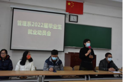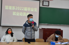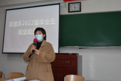 为了帮助2022届毕业生更好地了解当前的就业政策和就业形势、把握就业机会,管理系于11月9日在东阶101教室召开了2022届毕业生就业动员会。此次会议同时也是我系落实“我为群众办实事”要求的具体举措之一。会议通过“线上”+“线下”两种方式同时进行,由系主任刘海英老师主持,系党总支书记崔振华老师、系学工办主任蒋愿望老师、部分教师代表及管理系2022届全体毕业生参会。