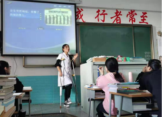 在本学期开学的前几天,她不小心摔了一跤,右脚趾骨断裂性骨折。当她去医院的时候,医生建议打石膏,并至少卧床三个月,不要剧烈运动。当张蕾老师问道是否可以上课时,医生告诉她,如果她得不到足够的修养,很可能会留下后遗症,甚至有可能会影响终身的行走。尽管公司的领导和她的家人包括医生都在劝她休息,但张蕾老师坚持要给她的员工们上课,她说站在讲台上会让她感到踏实与满足。就在这种情况下她回到了工作岗位,每周十节课,一次课也没有落下,每次教研活动和公司活动也没有缺席,而且在完成教学任务的同时,还担任着东胜校区英语教学的管理工作。在受伤两个月后去复查的时候,医生告诉她,右脚趾骨恢复的不是很好,建议不要再继续工作了,但张蕾老师依旧选择奋斗在每一个需要她的地方,并且很完美的把它做好。