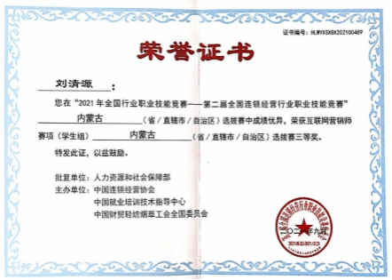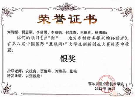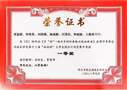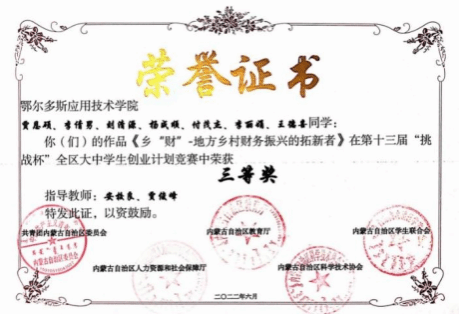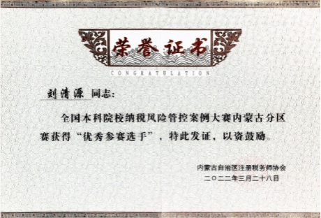 他在学科竞赛与创新创业领域,勤学苦练,刻苦钻研,不断提升专业能力与技能,荣获国家一等奖一项、二等奖一项、自治区级六项,并在全国本科院校纳税风险管控案例大赛内蒙古自治区荣获优秀参赛选手等荣誉称号。