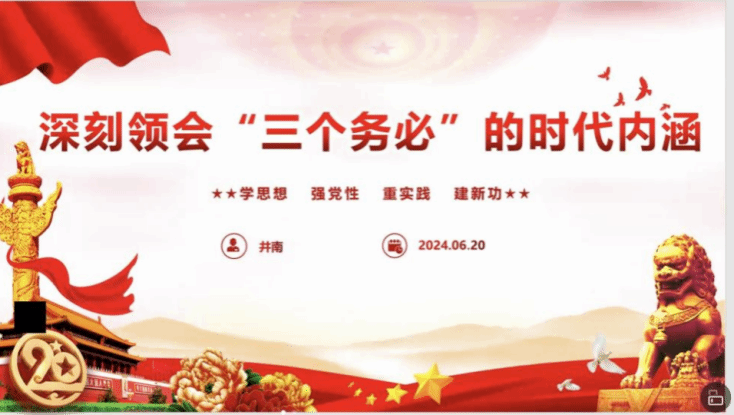 为了深入贯彻落实党中央的决策部署,加强党性修养,推进党史学习教育,深刻领会“三个务必”的时代内涵,铸牢中华民族共同体意识,管理系分党校于2024年6月20日晚7点,通过线上线下的形式举行了2023-2024学年第二学期的第五次培训。本次培训主要由党总支组织委员石晓燕、党总支宣传委员陈静及员工支部书记井南主讲,旨在提升员工的政治觉悟和理论素养,激励员工汲取党的历史智慧,为实现中华民族伟大复兴的中国梦不懈奋斗。