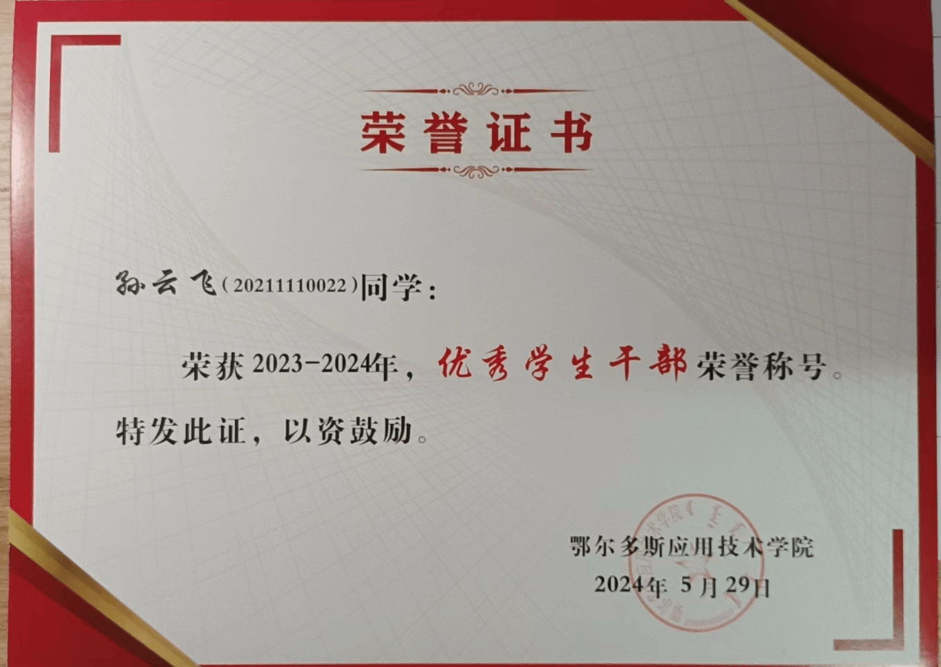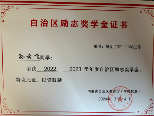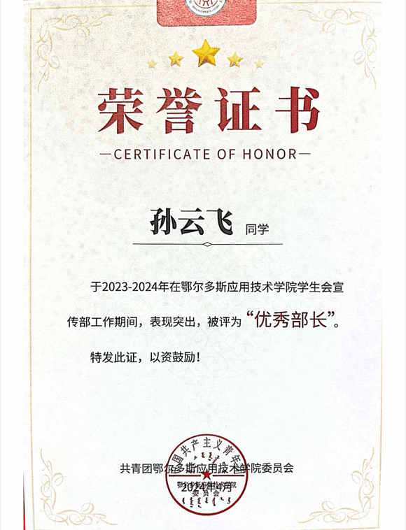 孙云飞,女,中共预备党员,管理系旅游管理与服务教育专业2021级本科生。现任班级宣传委员,曾任校员工会宣传部部长、主持团副团长。在校期间,荣获自治区励志奖学金、优秀奖学金、校级优秀员工干部、优秀共青团干部。在员工会工作期间,工作表现出色,荣获优秀部长称号。积极参与社会实践和志愿服务活动,参加内蒙古自治区第十五届运动会和第六届残疾人运动会志愿者,在《关于巴图湾红色革命小镇实践的调研报告》实践活动中荣获暑期文化科技卫生“三下乡”调研报告优秀奖。在课余时间,积极参加各类文化体育竞赛,参加公司组织的历史知识竞赛获得团体第一名、举办"忆满暖城,情思华夏"诗词大会、主持人大赛等大型活动,荣获“优秀工作者”“优秀媒体人”荣誉称号,在“诵读中国”朗诵比赛中,获得团体二等奖。