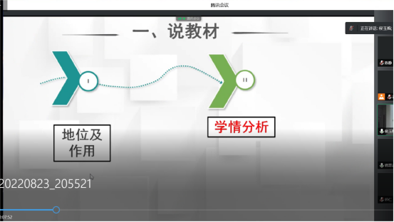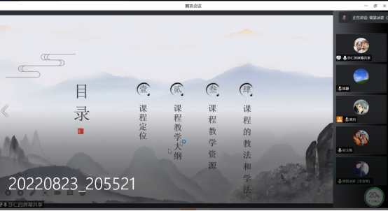为进一步提升教师的教学水平,根据公司本科教学评估要求,大学语文教研室于2022年8月23日晚在线上组织了“教师讲课程”教研活动。通过说课、讲课和讨论环节,老师们对新学期课程的定位、设计理念与思路、教材、教学方法与手段、课程特色及改革等都有了更全面的理解,老师们围绕改进教学方式、提升教学水平交流了经验。系教学督导李咏梅副教授进行了点评,教研室主任陈静老师对本次活动进行了总结。
