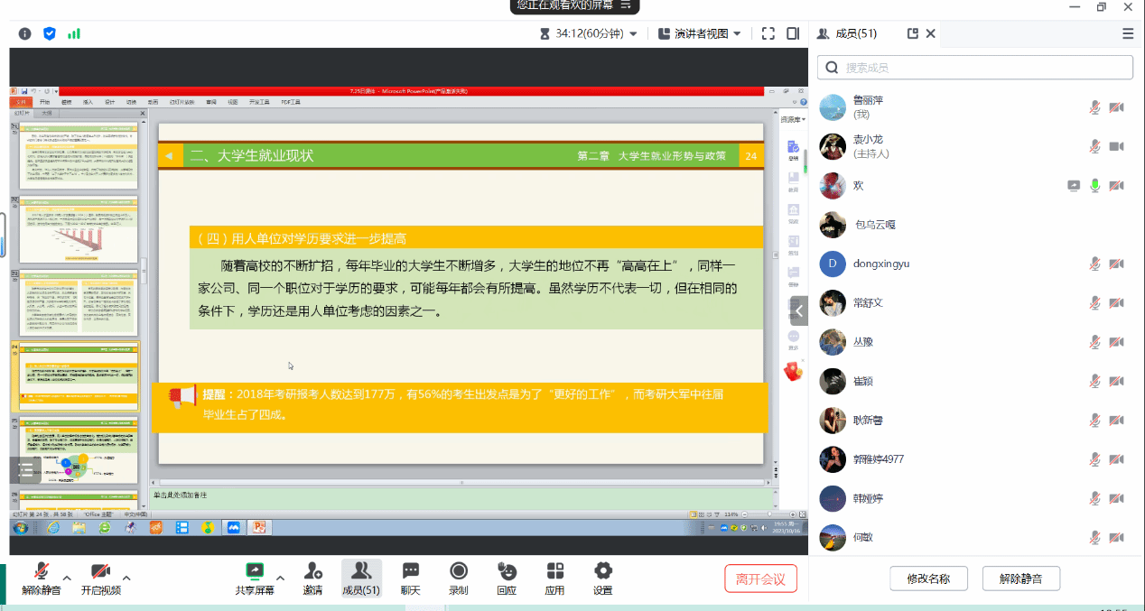 会上,鲁丽萍主任首先作了动员讲话。王木兰副书记深入剖析了当前的就业形势,并对就业相关手续进行了详细讲解。袁小龙老师介绍了就业政策及就业信息渠道,王扬老师结合自身经历向同学们分享考研流程及各环节的注意事项。会议最后,师生互动交流,老师们就员工们对于就业、考研的疑惑进行了解答。