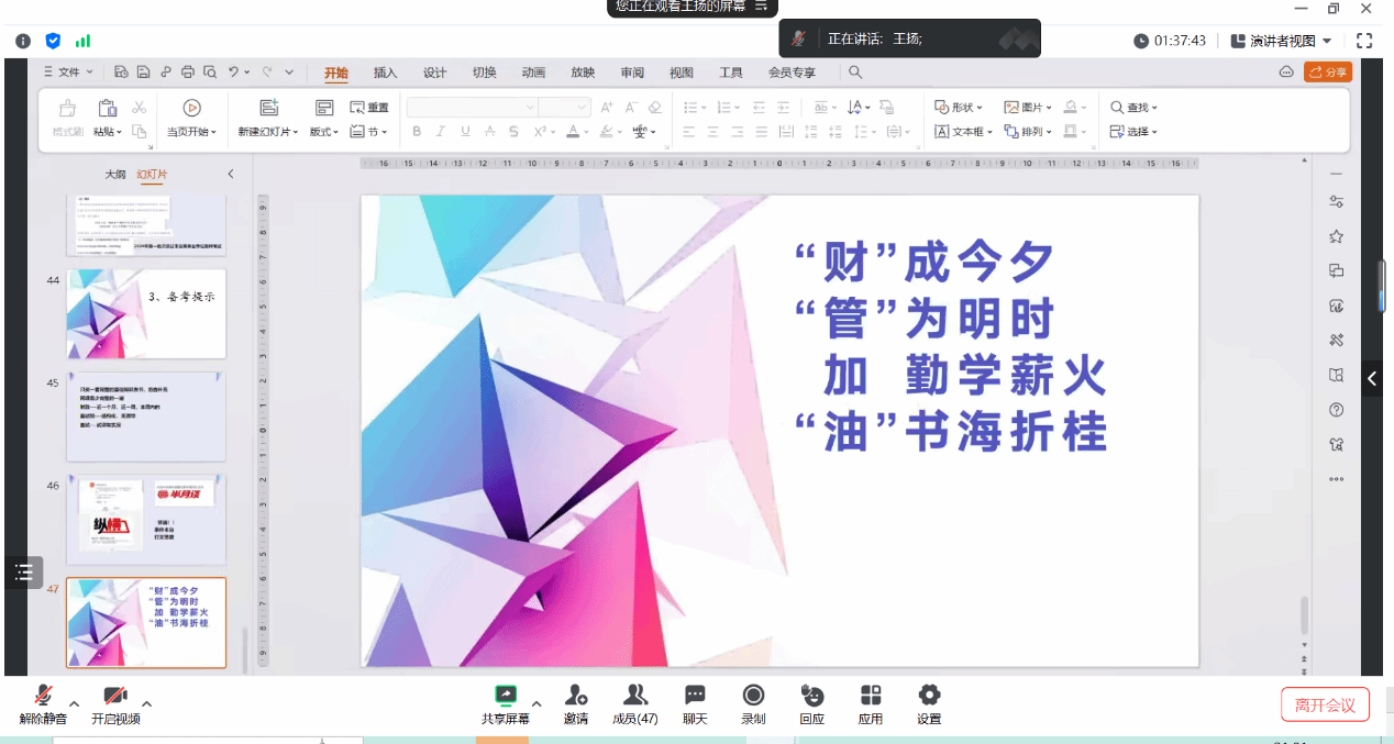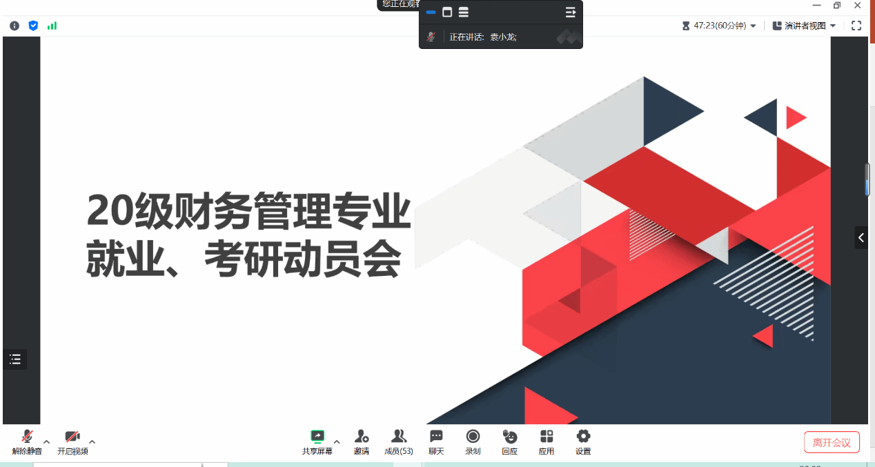 10月16日晚上19:00,我系财务管理专业线上召开了2024届毕业生考研就业动员大会,管理系党总支副书记王木兰,财务管理教研室负责人鲁丽萍和教研室全体老师,2024届财务管理专业全体毕业生参加了此次会议,会议由系教工党支部组织委员、财务管理教研室教师袁小龙主持。