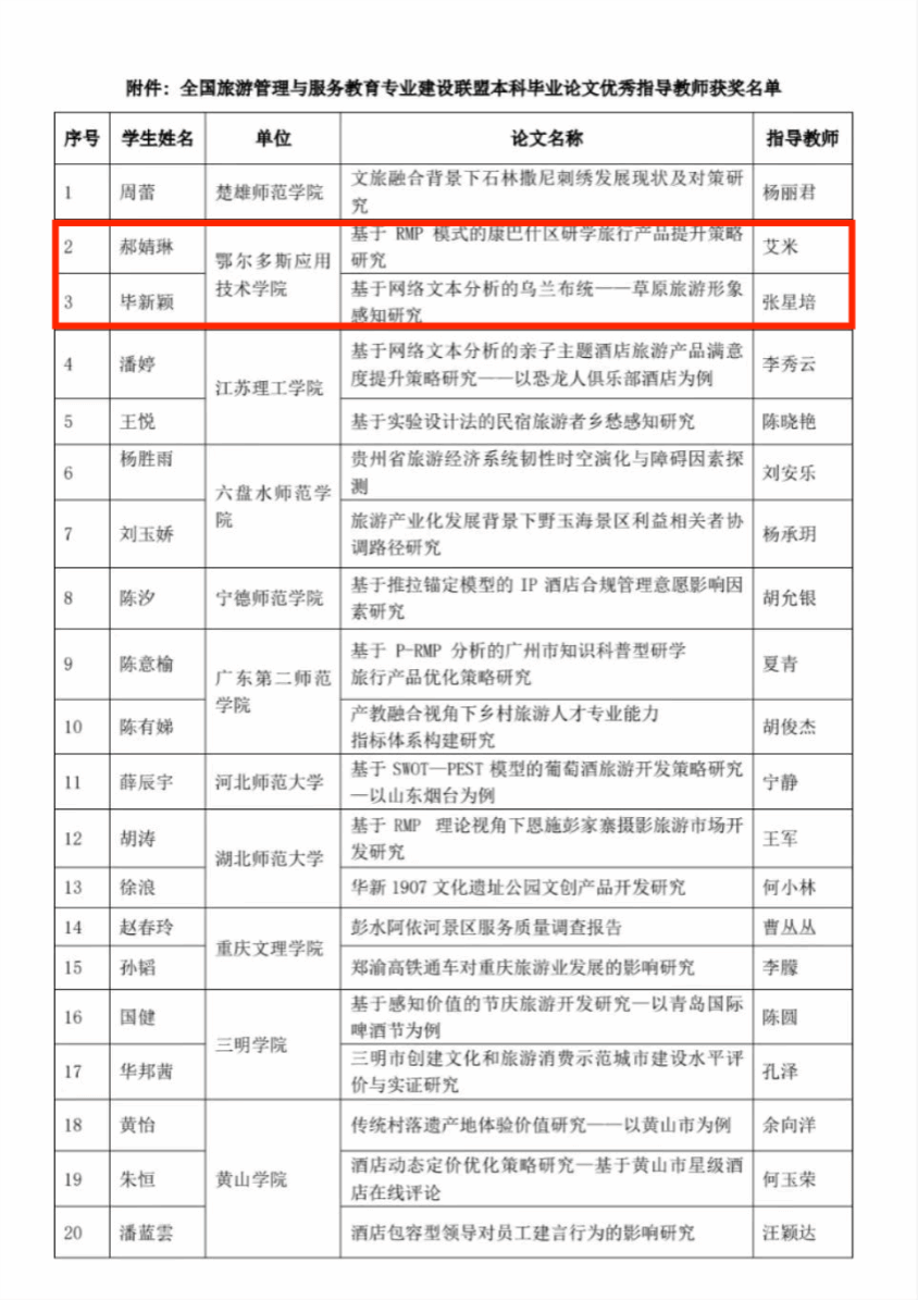 本次大会评选出了第二届“天元杯”优秀论文指导教师名单,我系旅服教研室艾米老师与张星培老师被评为优秀本科毕业论文指导老师。