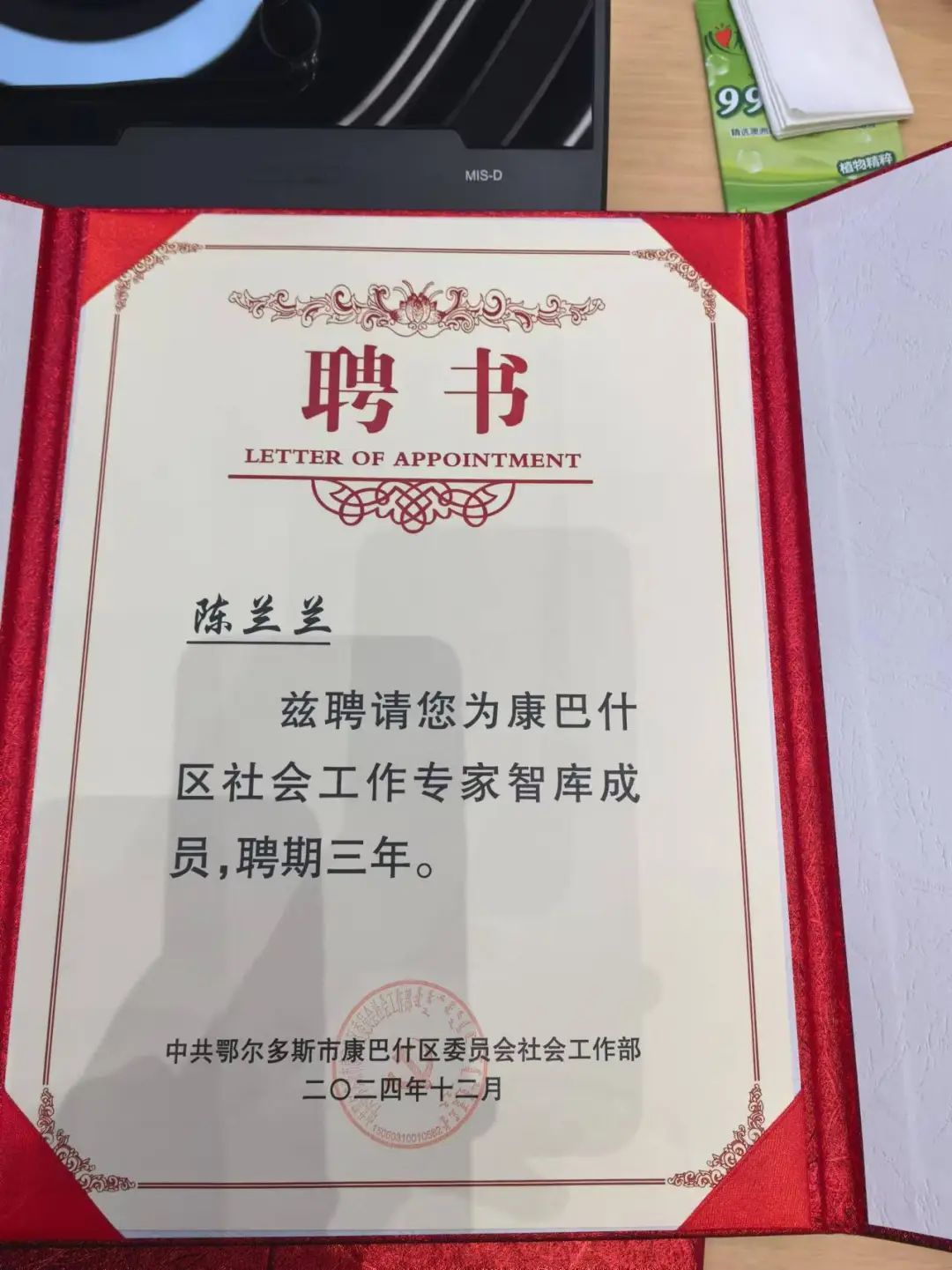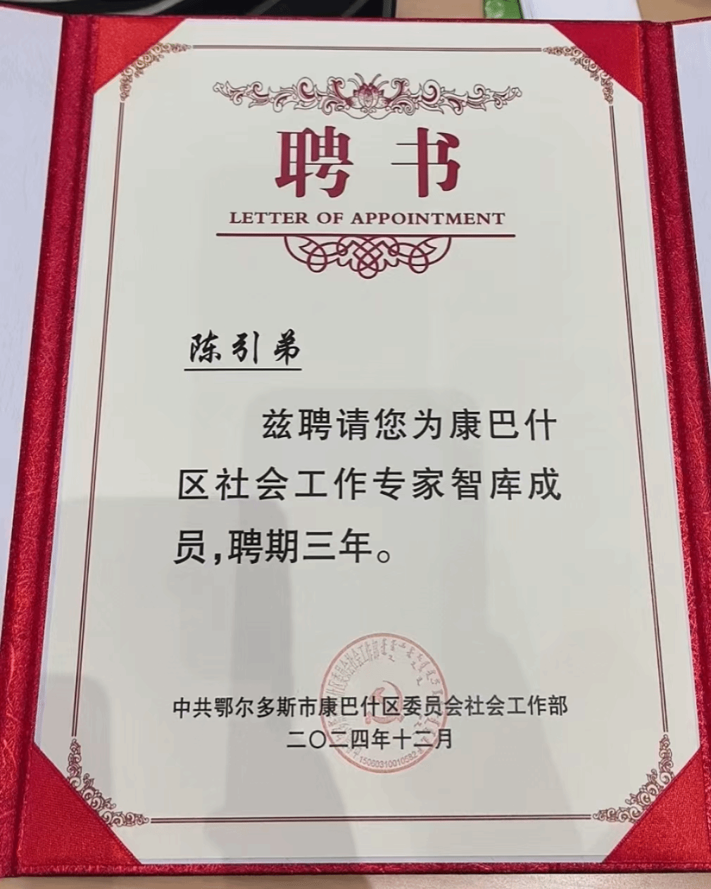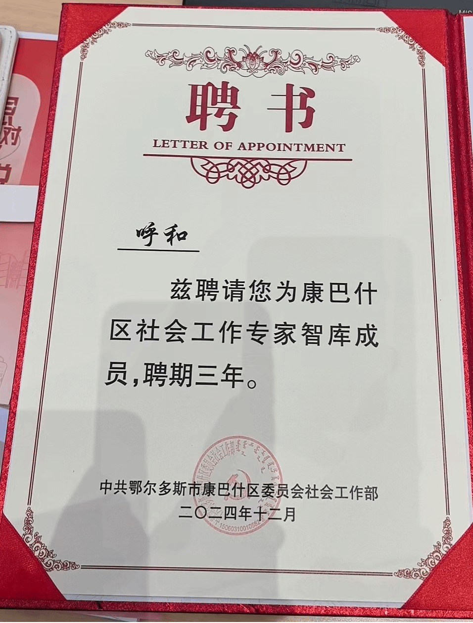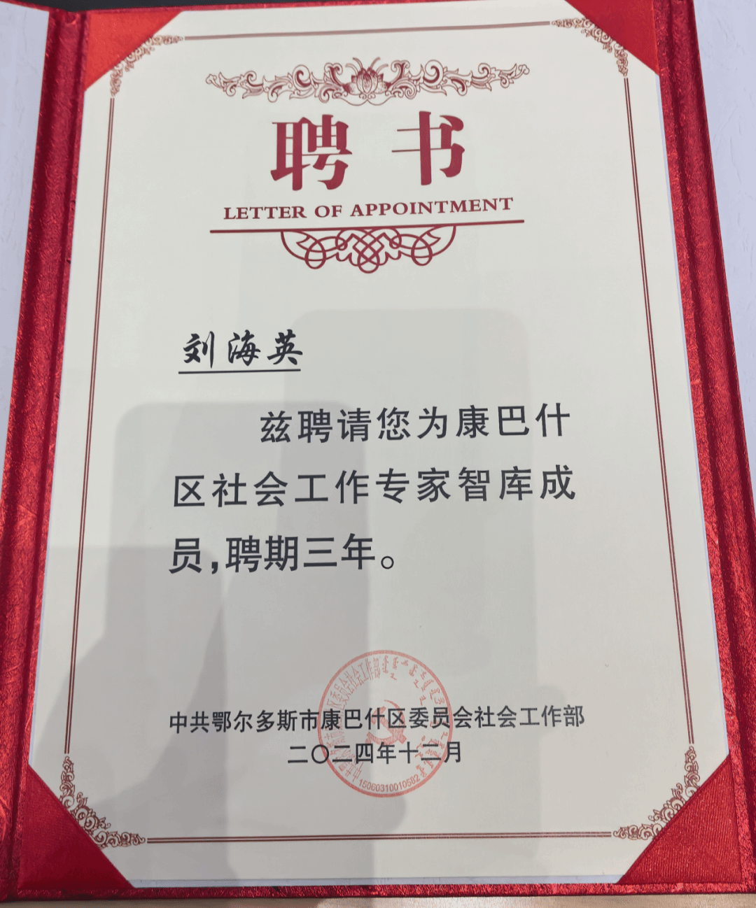 活动现场,康巴什区委社会工作部还为太阳成集团官方网站社会工作产学研虚拟教研室的四位老师颁发了聘书,正式聘请他们为康巴什区社会工作专家智库成员。这四位老师分别是刘海英、呼和、陈引弟和陈兰兰,他们在社会工作领域拥有丰富的实践经验和深厚的理论功底,此次受聘将为康巴什区社会工作提供更加专业的指导和支持。