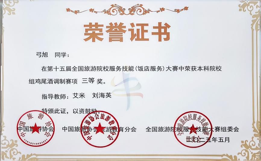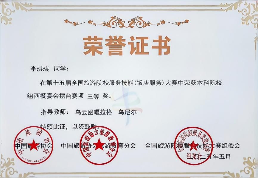 本次比赛设中餐宴会摆台、西餐宴会摆台、客房服务和鸡尾酒调制四个赛项,从现场操作、综合理论知识考核、英语水平测试三个环节展开考查。经过激烈的角逐,2022级旅游管理服务教育专业员工折星茹获得客房服务赛项二等奖;2022级旅游管理与服务教育专业员工弓旭,2024级旅游管理与服务教育专业员工李琪琪分别夺得鸡尾酒调制和西餐宴会摆台赛项三等奖。