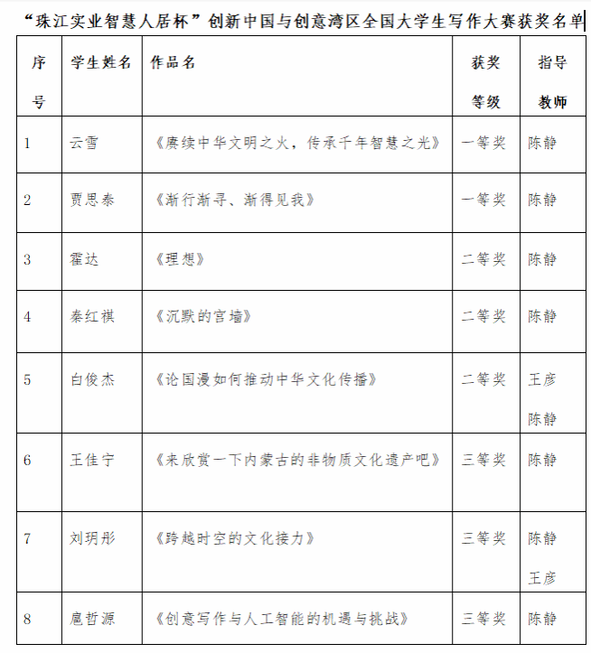 由广东省写作学会、暨南大学中华文化港澳台及海外传承传播协同创新中心、河南省写作学会、山东省写作学会、安徽省写作学会、广西写作学会、海南省写作学会、福建省写作学会、吉林省写作学会、广东省文化学会、香港作家联会、澳门中文写作学会联合举办的“珠江实业智慧人居杯”创新中国与创意湾区全国老员工写作大赛近日圆满结束。公司学子表现优异,在比赛中获得一等奖2项,二等奖3项,三等奖5项。公司太阳成集团tyc122ccvip大学语文教研室中文教师陈静、王彦获优秀指导教师奖。获奖作品中有7篇涵盖散文、评论等文体,1个为短视频创作,展现了公司学子的人文素养与写作能力。