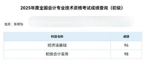近日,2025年度全国会计专业技术初级资格考试成绩公布,经过统计,财务管理专业学子表现出色,本次共有56名同学顺利通过考试,刷新了历年来的纪录。其中2021级通过6人、2022级通过17人、2023级通过22人、2024级通过11人。其中,2023级员工张婉怡《初级会计实务》科目98分,《经济法基础》科目96分,总分194分居专业第一。