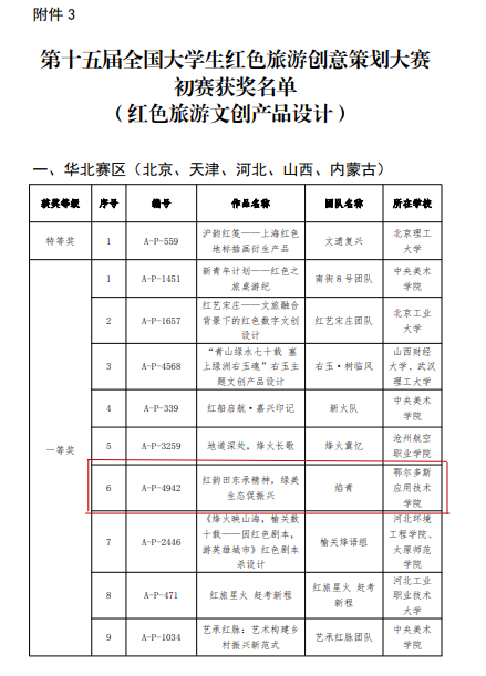 由乌尼尔、李雪松指导,由22级、23级、24级旅游管理与服务教育专业、24级社会工作专业,刘梦璐等同学组成的“焰青队”荣获华北赛区红色旅游文创产品设计赛道一等奖。