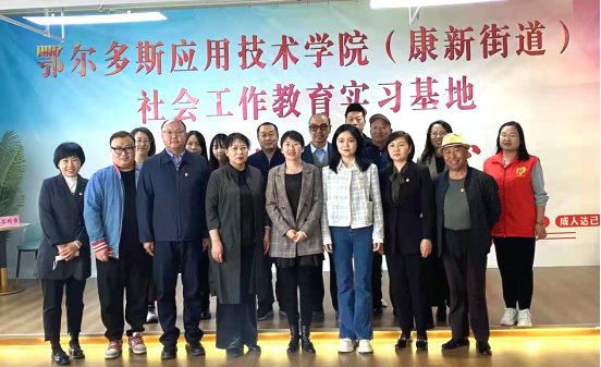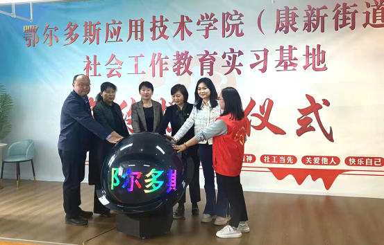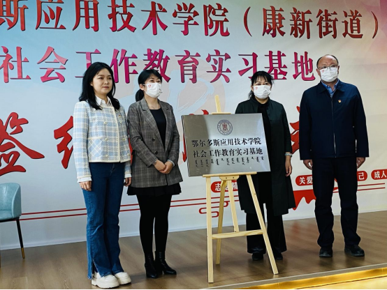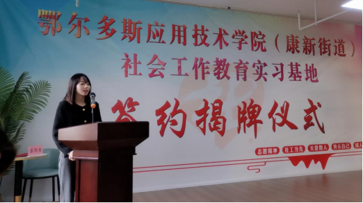 4月13日,我系社会工作教研室与康巴什区康新街道共建的“社会工作实习教育基地”签约揭牌仪式在康新街道举行。康巴什区副区长孙榕,区民政局局长刘海江、副局长袁小梅,我系教工党支部书记李咏梅、社会工作教研室负责人呼和,康新街道党工委书记、党群服务中心主任杨怡然、康新街道党工委副书记、办事处主任郝斯鲁及各社会组织负责人等20余人出席了签约揭牌仪式。