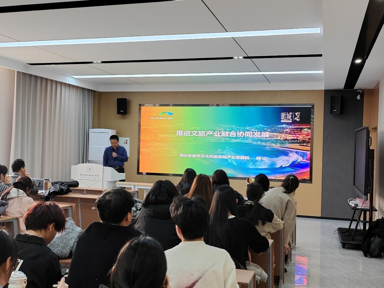 讲座伊始,阎山科长从鄂尔多斯市文旅产业的整体布局出发,深入剖析了当下文化旅游协同发展的重要性与紧迫性。阎科长结合大量本地实际案例,如准格尔黄河大峡谷旅游区将科学性、知识性、趣味性与观赏性相融合,通过多元化展示手法,让游客沉浸式体验黄河文化与草原文化;萨拉乌苏考古遗址公园凭借申报国家级考古遗址公园和世界自然与文化 “双遗产”,吸引大量游客探寻古代文明,实现文旅融合发展的新突破。这些生动案例让同学们直观感受到文化旅游协同发展所带来的巨大魅力与潜力。