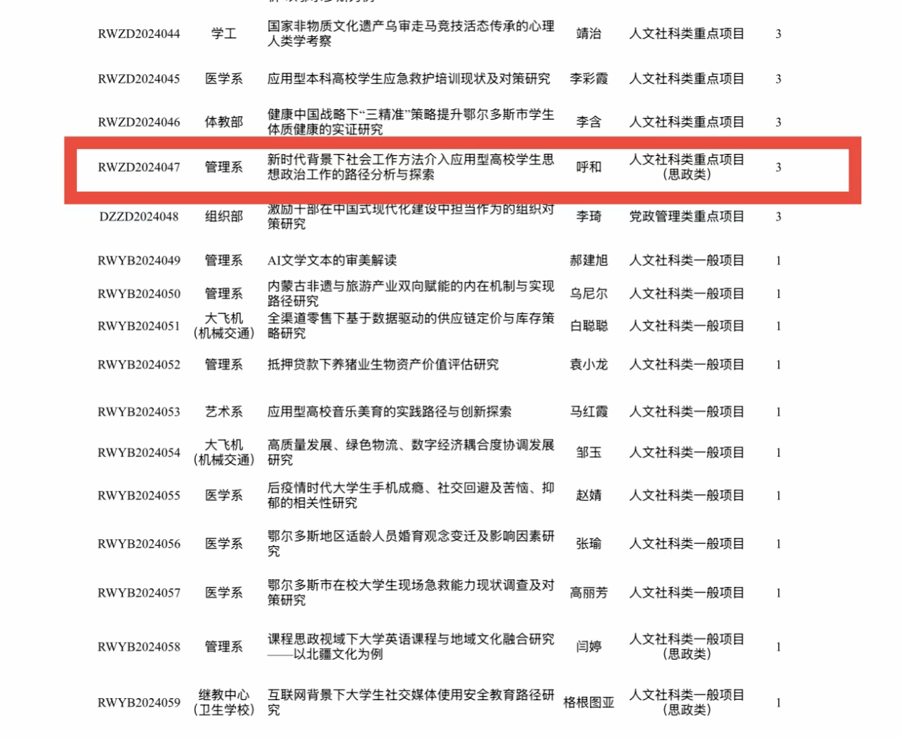 其中,社会工作教研室呼和老师成功获批校级科研重点项目。该项目是对呼和老师个人努力的认可,也将为专业教学与实践提供有力支撑。相信在社会工作教研室全体老师的努力下,必将在科研道路上迈出更坚实的步伐,为公司发展贡献更多力量。