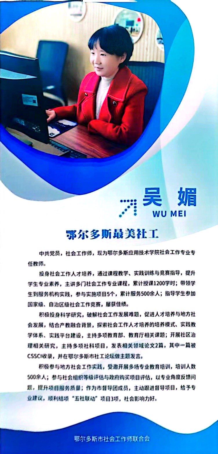 吴媚老师在获奖后表示,她深感荣幸和自豪,同时也感受到了肩上的责任重大。她表示将继续致力于社会工作研究和实践,为推动社会工作事业的发展贡献自己的力量。同时,她也希望更多的年轻人能够加入到社工队伍中来,共同为构建和谐社会而努力。