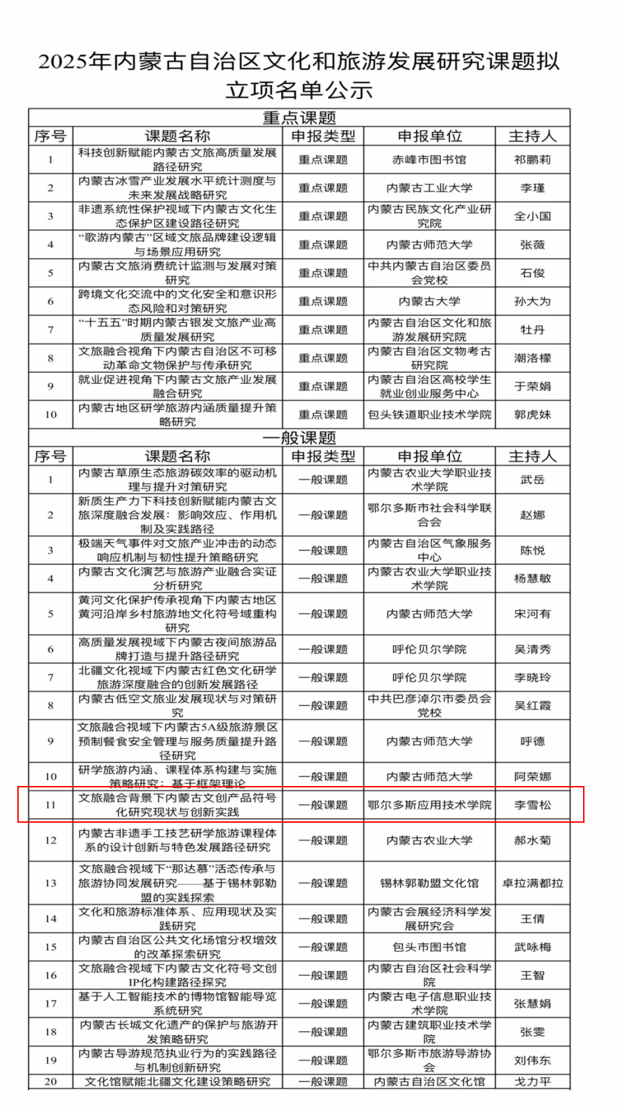 近日,内蒙古自治区文化和旅游厅公示了2025年度文化和旅游发展研究课题拟立项名单,太阳成集团tyc122ccvip教师李雪松成功获批课题立项(一般课题)。
