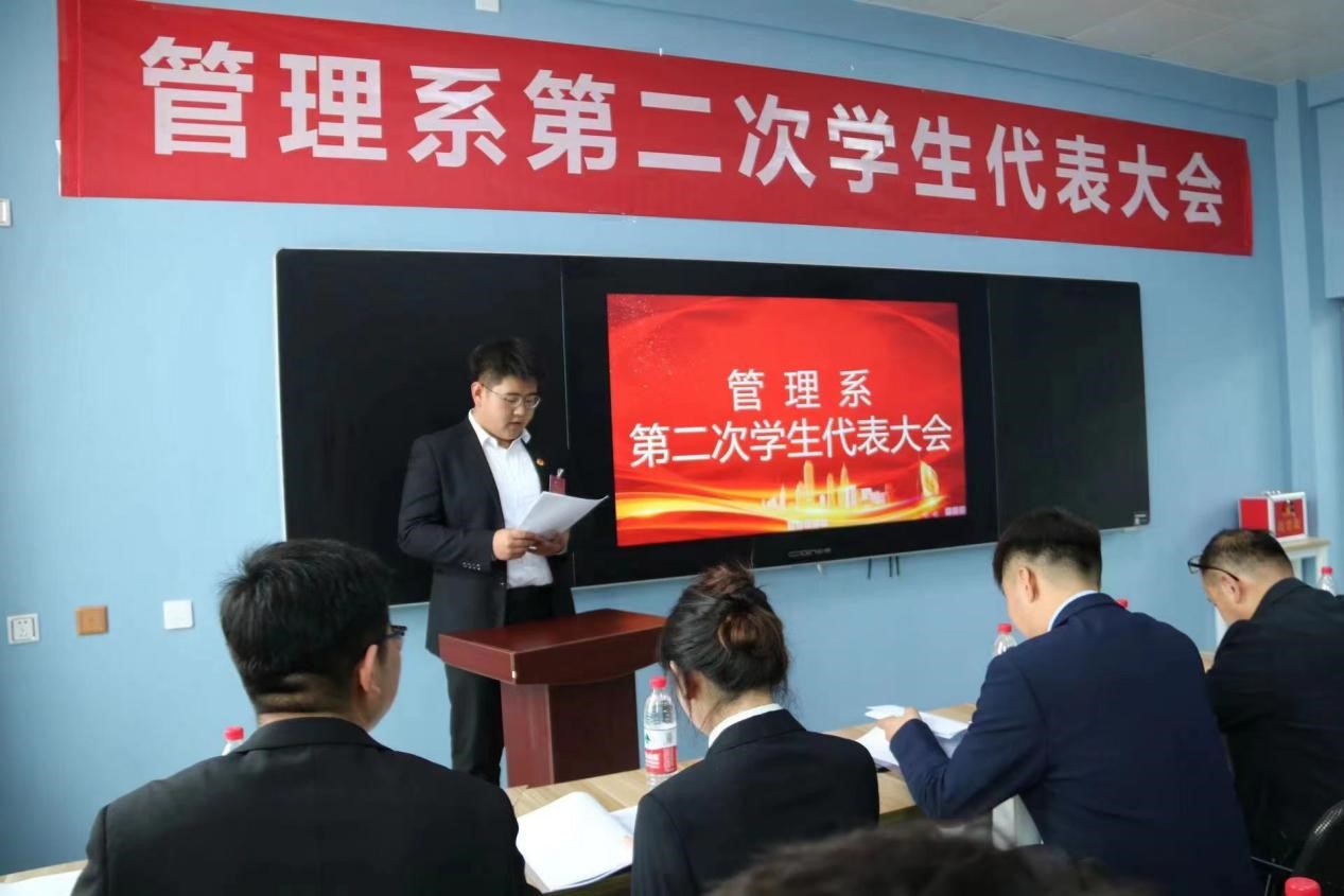 管理系系党总支书记徐恒泰致辞,他对本次大会的成果进行总结,并且对全体代表提出几点希望。一是要注重自身提升,争做表率。二是要创新发展,积极引领组织创新活动。三是要做好上传下达工作,切实做好桥梁纽带作用,以更好的解决员工在学习、生活、就业、创业等方面的困难维护员工权益。同时更希望我们勤于学习,敏于求知,勇担时代重任。