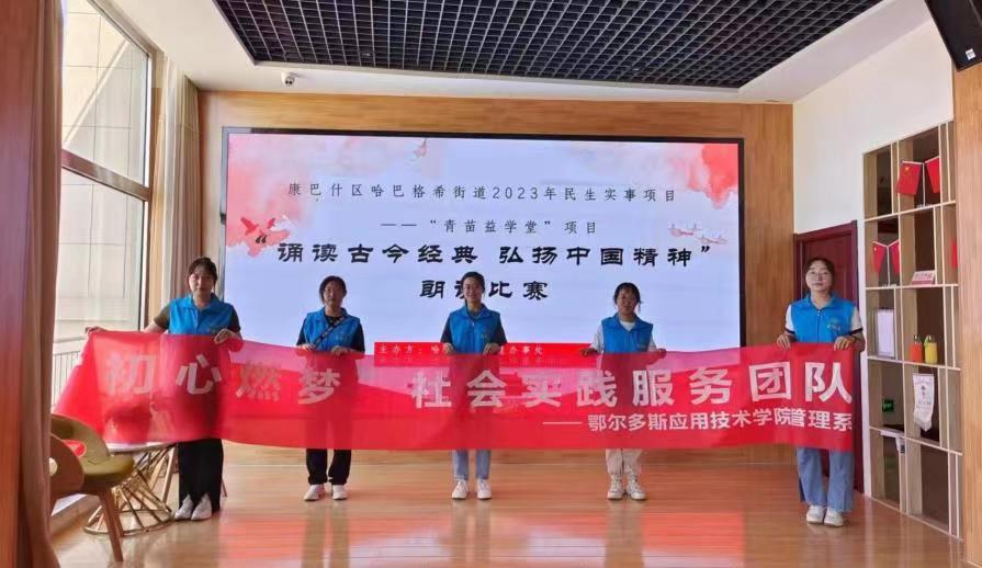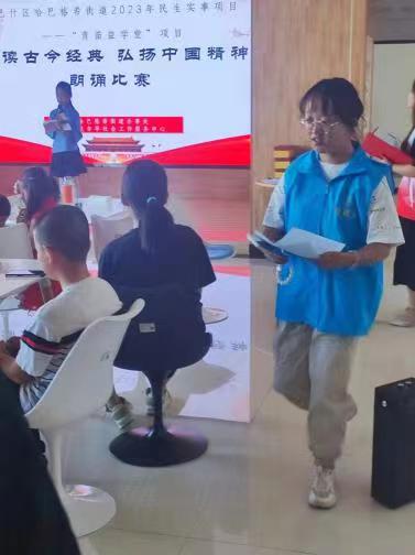 本次社会实践以“诵读古今经典,弘扬中国精神”为主题,举办了社区儿童朗诵比赛。在整个活动过程和工作细节中,志愿者们紧密配合,通力合作,共同完成了从签到、计分与发奖品等各项任务。活动进行过程中,志愿者们以学促干,积极应对突发状况。在同学们的共同努力下,此次活动圆满完成。