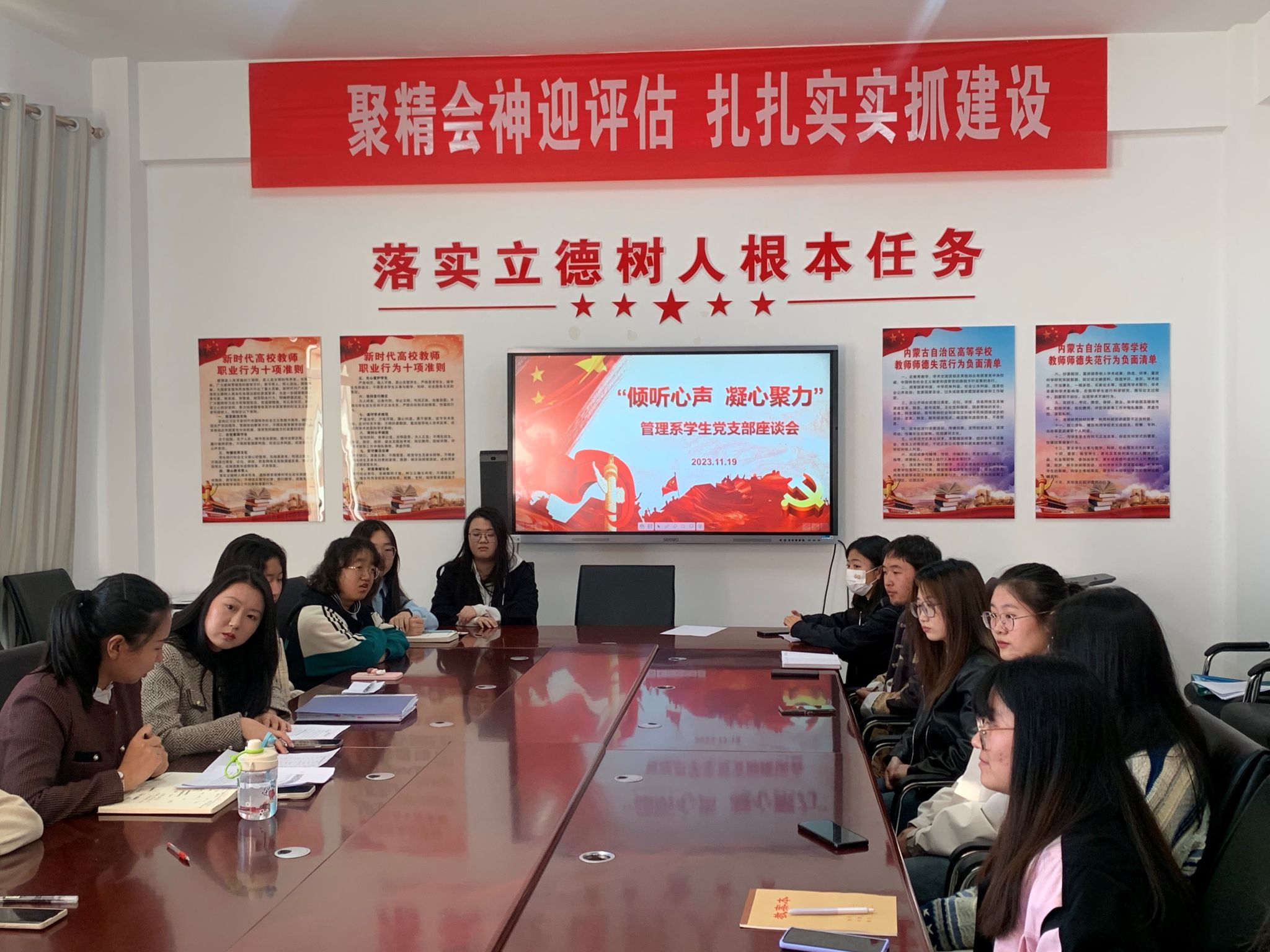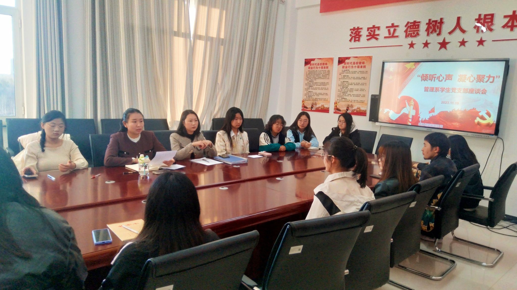 为贯彻习近平新时代中国特色社会主义思想主题教育,认真落实“我为员工办实事”,管理系员工党支部于11月19日下午召开“倾听心声 凝心聚力”员工座谈会。会议由员工支部书记井南老师主持,员工支部组织委员张雪璐老师,我系2021级、2022级先锋班员工及各班级员工代表参加了本次会议。